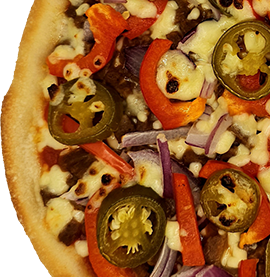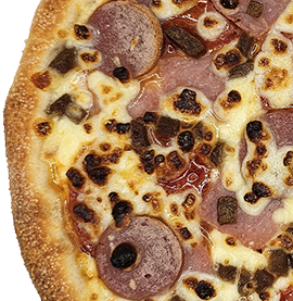 Small pizza with 2 toppings & a can of drink.